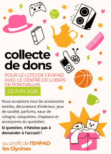 Dans le cadre du loto organisé conjointement par l’EHPAD et l’ALSH de Pontvallain, le 3 juin 2026, nous faisons appel à votre générosité pour enrichir notre tombola.